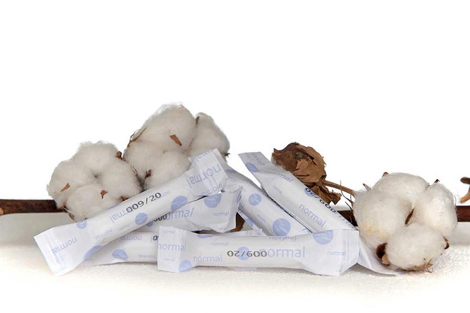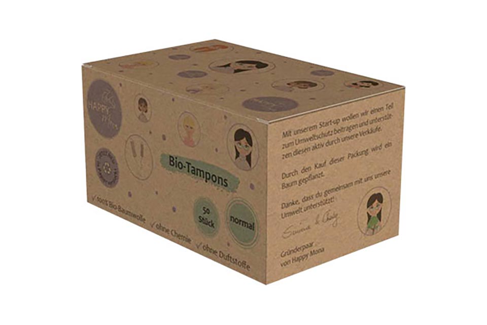 Bio-Tampons werden ohne Plastikfolie in Papier verpackt. Happy Mona Bio-Tampons, Bio-Slipeinlagen und Bio-Binden werden aus 100% Bio-Baumwolle hergestellt. Schluss mit Plastik, Chlor, Farb- und Duftstoffen.